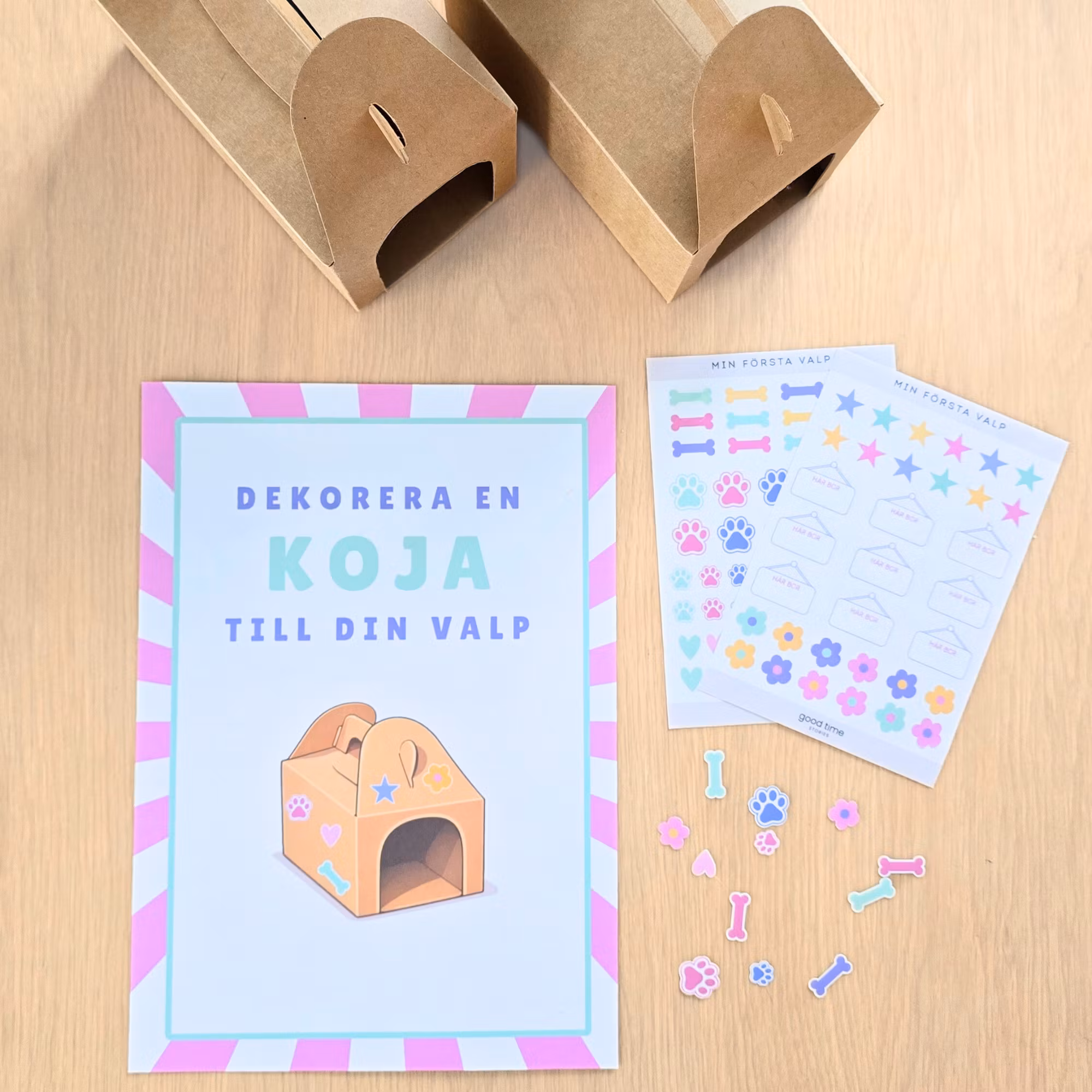Självklart behöver valpen också ett hem! När halsband och adoptionsbevis är klara fortsätter kalaset med att montera och dekorera hundkojor. Med stickers och namnskylt skapar varje barn en unik koja – och tar sedan stolt med sig både valp och koja hem efter kalaset.