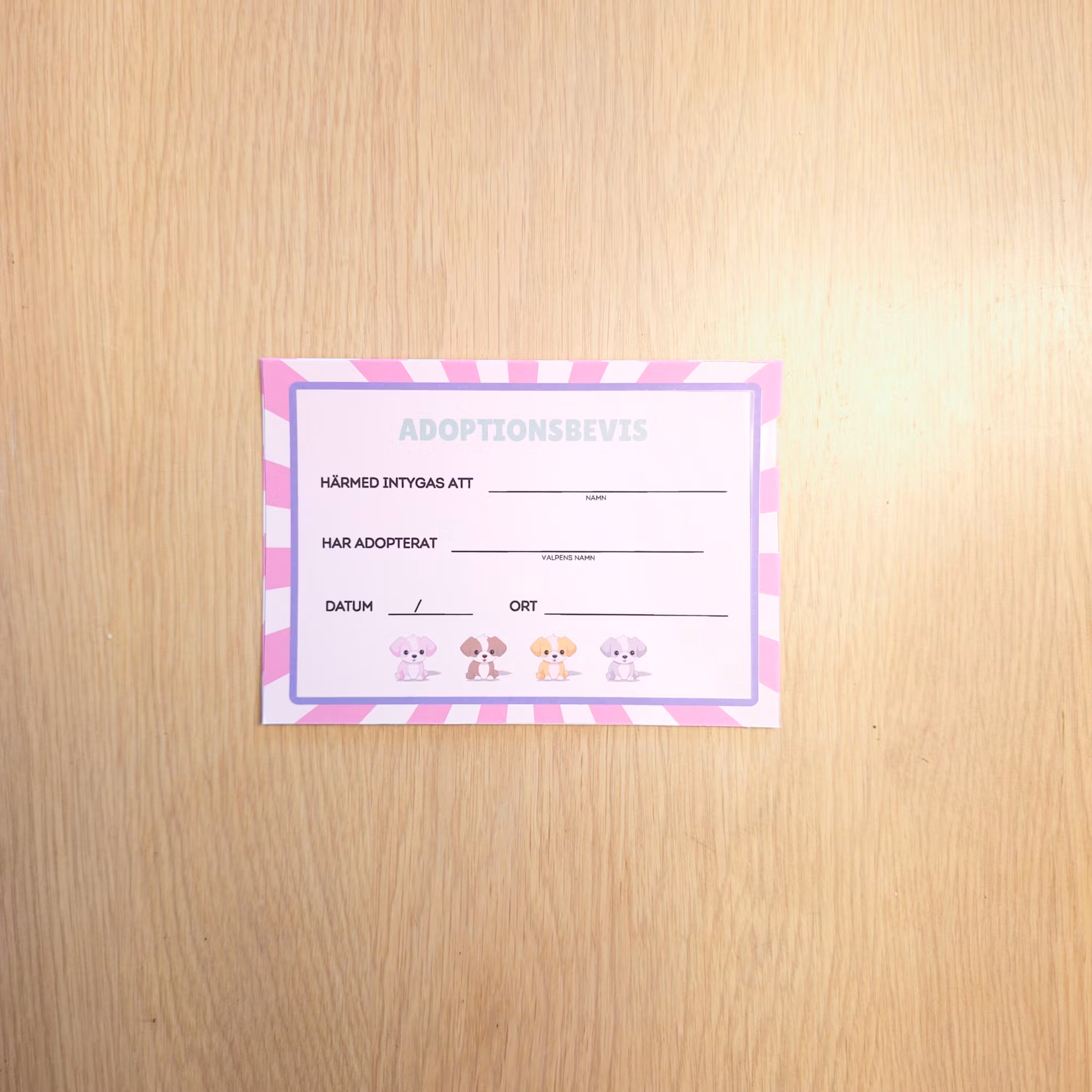 Kalaset börjar med att ni låter barnen välja varsin favoritvalp, ge den ett namn och fylla i sitt alldeles egna adoptionsbevis. När valpen är adopterad är det dags att pyssla ett personligt halsband och skriva namnet på namnbrickan.